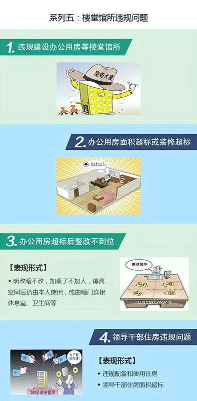 6.其他(包括6种表现:违规配备和使用公车、楼堂馆所问题、提供或接受超标准接待、组织或参加用公款支付的高消费娱乐健身等活动、接受或提供可能影响公正执行公务的健身娱乐等活动、违规出入私人会所、领导干部住房违规)。