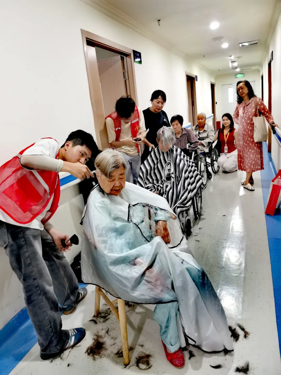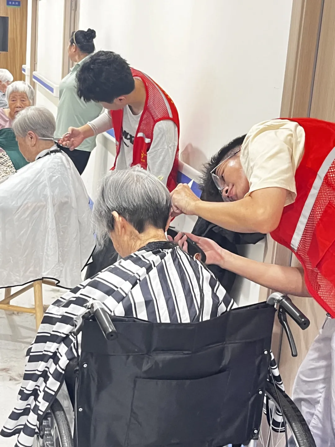 活动现场气氛热烈且温馨。两位专业理发师早早来到护理院,迅速准备好理发工具,以饱满的热情投入到为老人理发的工作中。他们耐心地询问每一位老人对于发型的需求,精心为老人修剪头发。老人们坐在椅子上,脸上洋溢着幸福的笑容,对理发师的手艺赞不绝口。在理发的过程中,志愿者们也没有闲着,他们一边陪伴老人聊天,倾听老人们的心声,一边帮忙清理剪下的头发,整个现场井然有序。