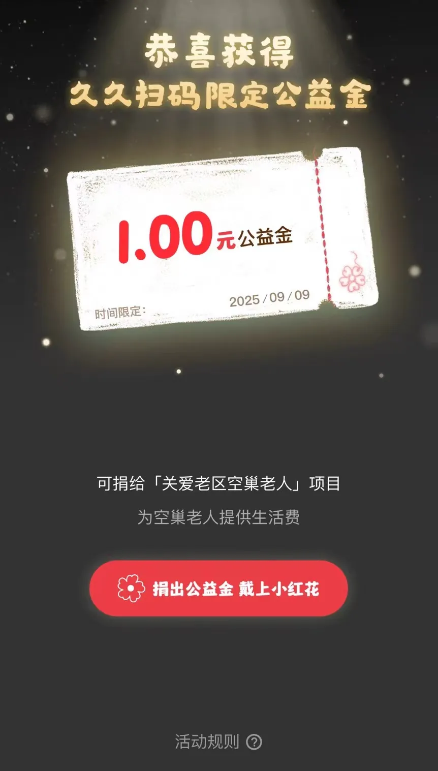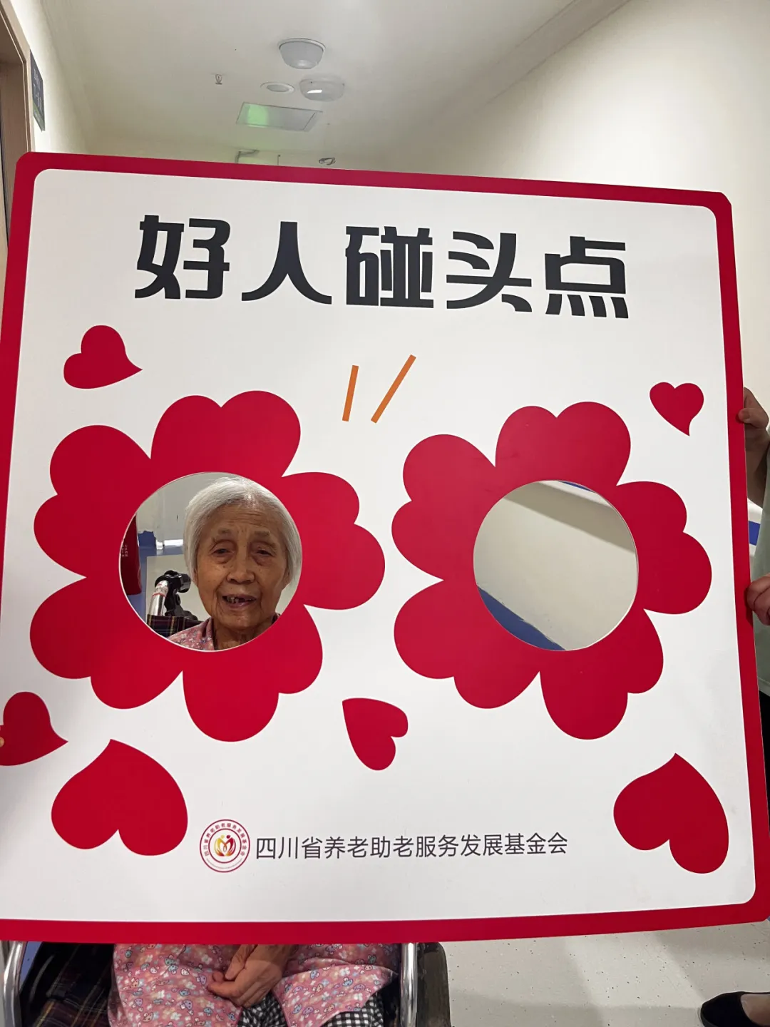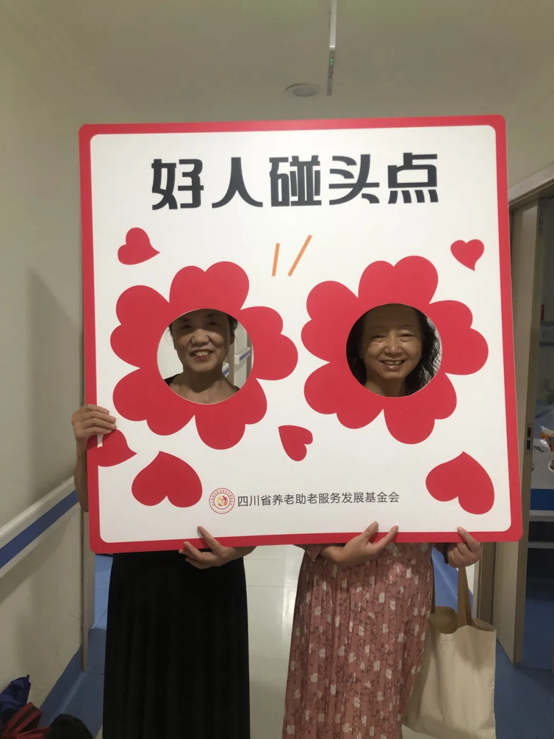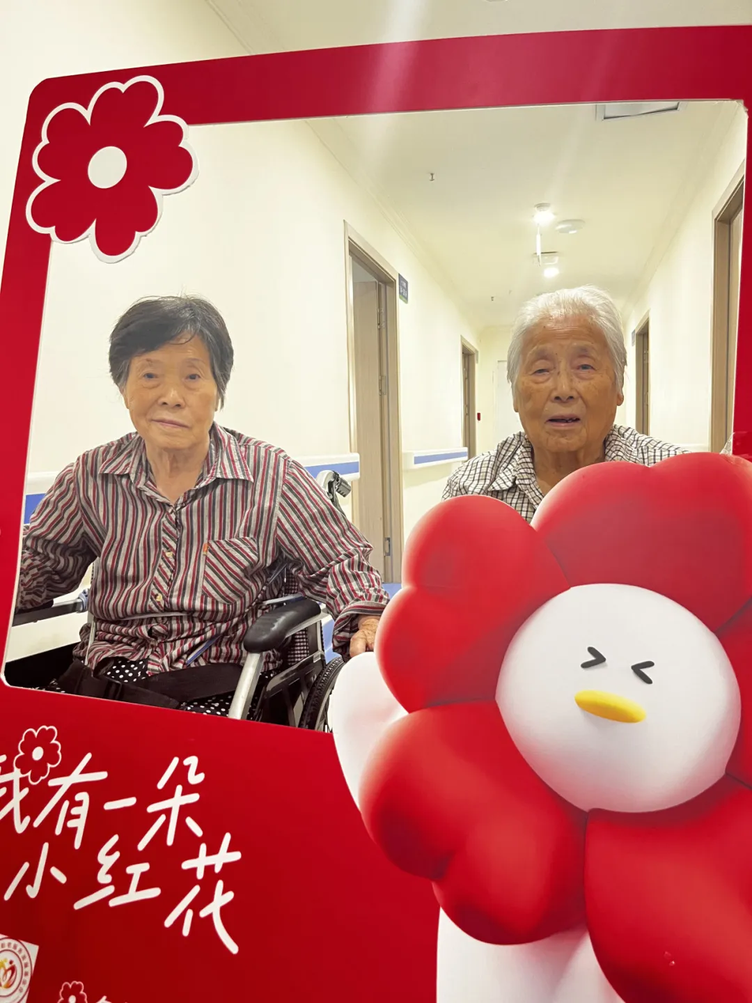 活动现场还设置了拍照打卡区域,两位老人手持写有 “我有一朵小红花” 字样的久久公益节打卡道具合影留念,留下了美好的瞬间,也让老人们感受到了活动的趣味性和仪式感。